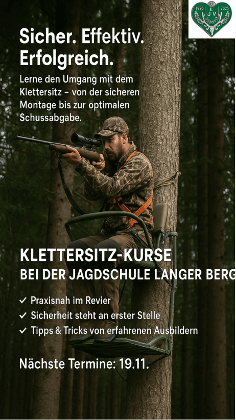 Die Jagdschule Langer Berg und der Landesjagdverband Thüringen e.V. bieten ein gemeinsames Praxisseminar zum sicheren Umgang mit dem Klettersitz an – von Aufbau und Handhabung bis zur sicheren Anwendung im Revier. Perfekt für alle, die hoch hinaus wollen und dabei auf Sicherheit, Technik und Effizienz setzen! Teilnahmegebühr: 130 € pro PersonMitglieder des LJVT sparen 30 […]